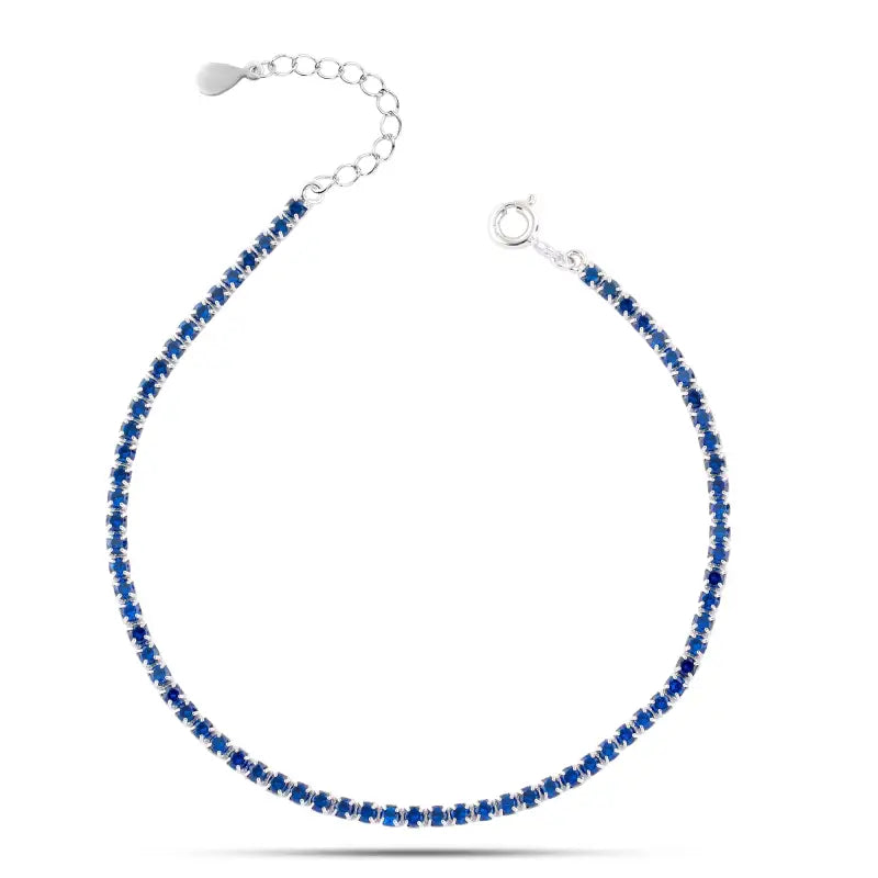 سوار تنس مصنوع من الفضة الإسترلينية عيار 925 بتصميم أنيق وعصري، مرصّع بأحجار زرقاء تُضفي لمسة من الرقي والجمال. يتميز السوار بسوار فضي أنيق ومتين، مرصع بأحجار زركون زرقاء مُرتبة بعناية تُبرز جمال اللون ببريق جذاب. يأتي مع مشبك مريح وسلسلة تمديد قابلة للتعديل، مما يجعله مثاليًا للارتداء اليومي أو المناسبات الخاصة.