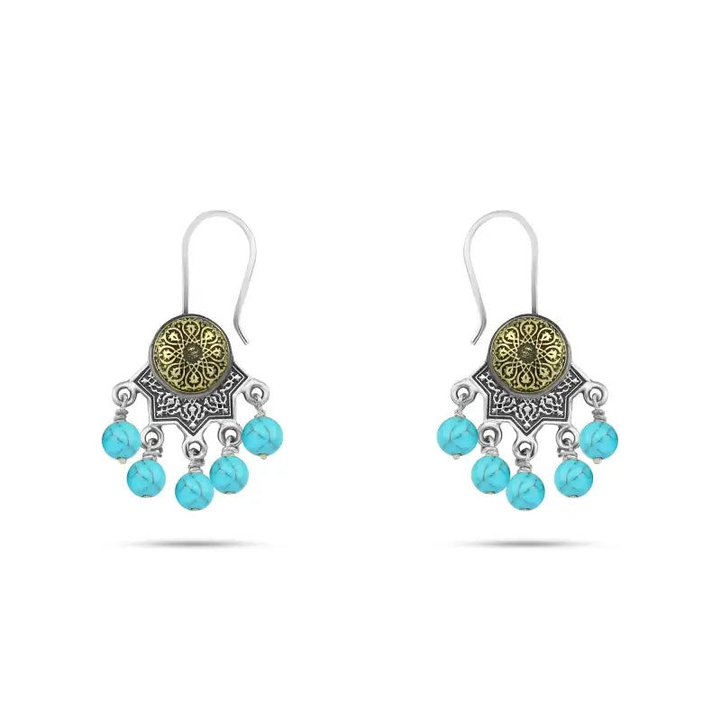 حلق فضة عيار 925 بتصميم عربي مزخرف بأحجار من الفيروز و مطعم بالنحاس