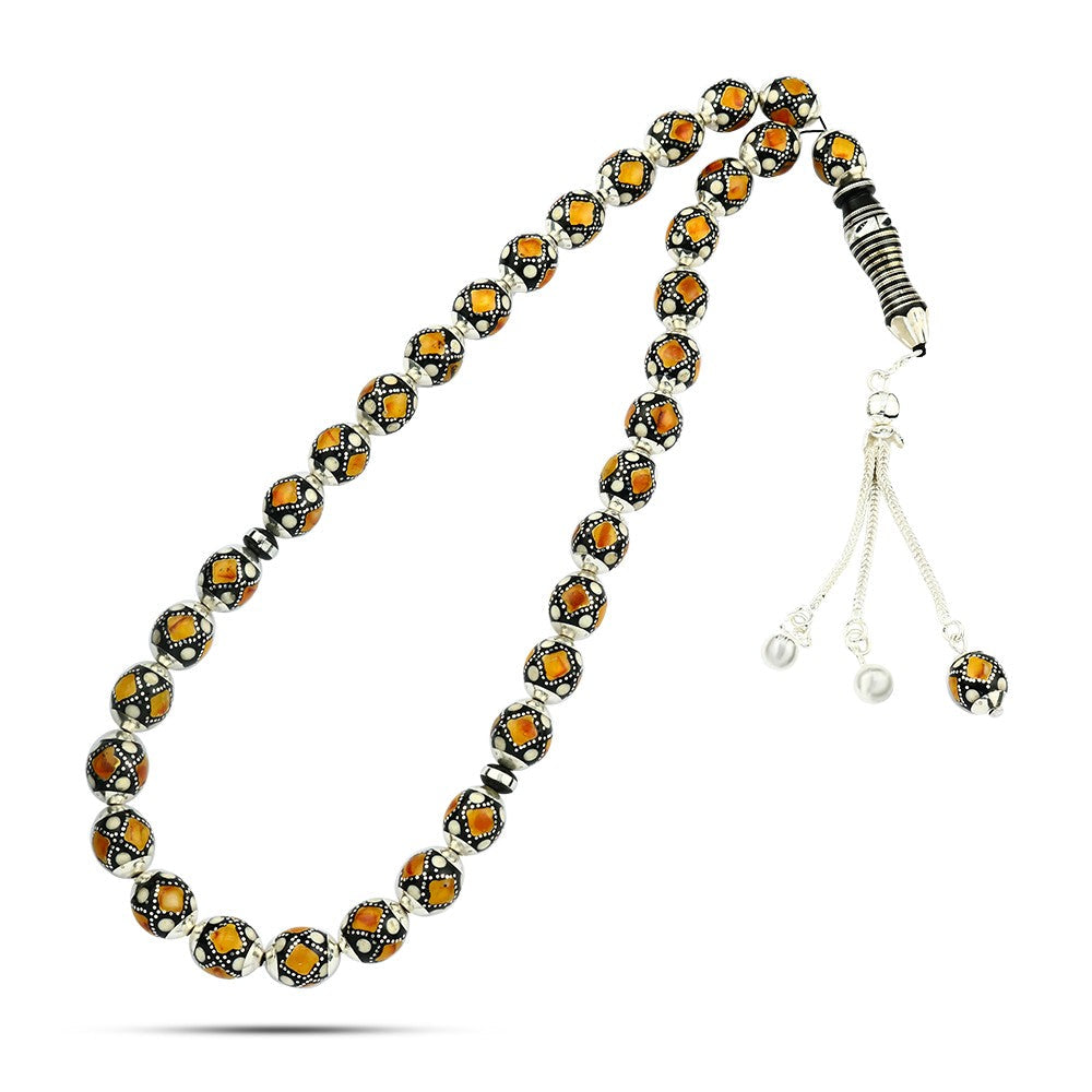 سبحه من اليسر الطبيعي مطعمة بالفضة والكهرمان وعاج طبيعي, 33حبة