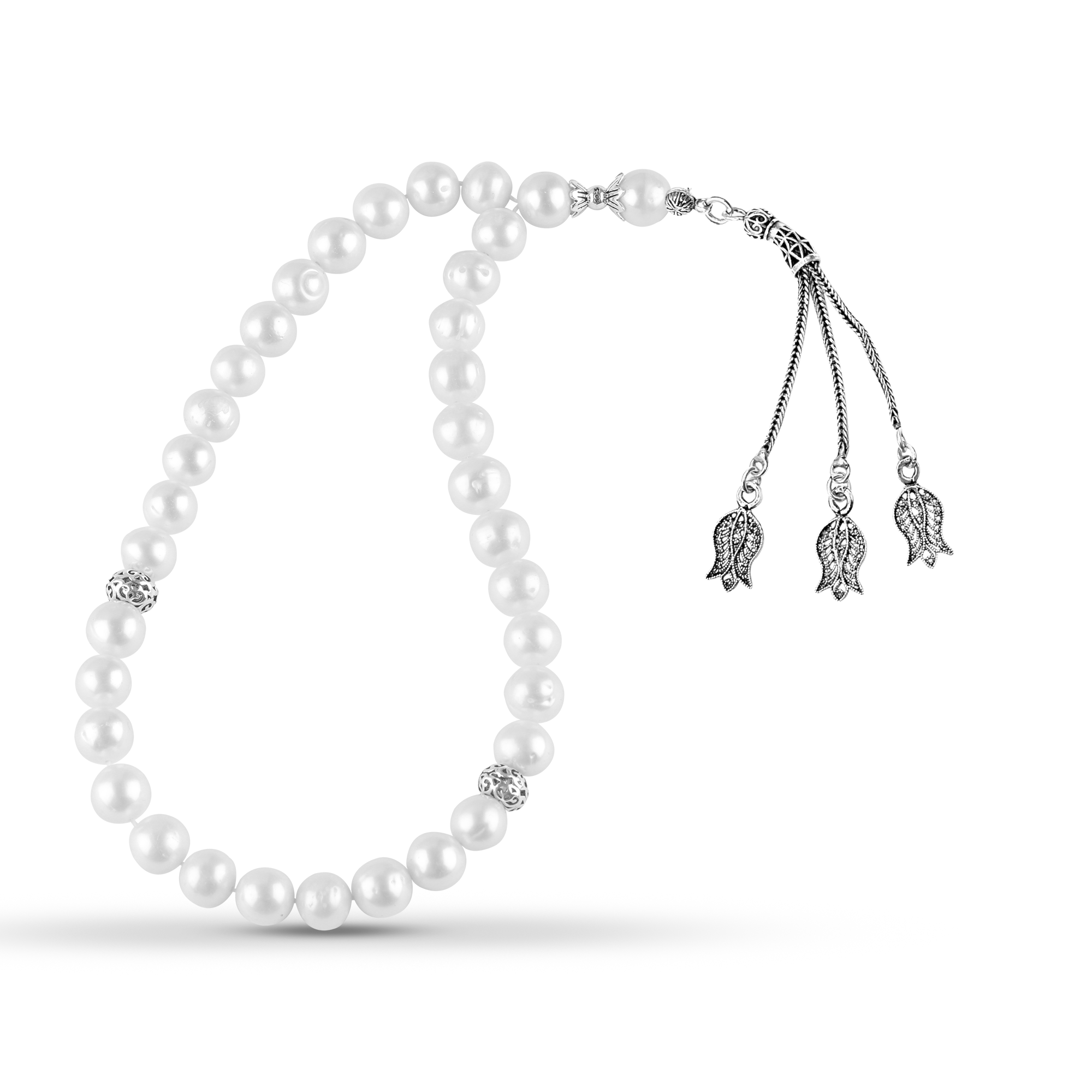 Enjoy the beauty of this luxurious rosary crafted from natural pearls, embodying purity and elegance. The beads are smooth oval (9 mm in size – a wheat-shaped shape), providing comfort and a sophisticated aesthetic. They are adorned with 925 Turkish silver spacers and elegant tassels, making them a symbol of sophistication and spirituality.