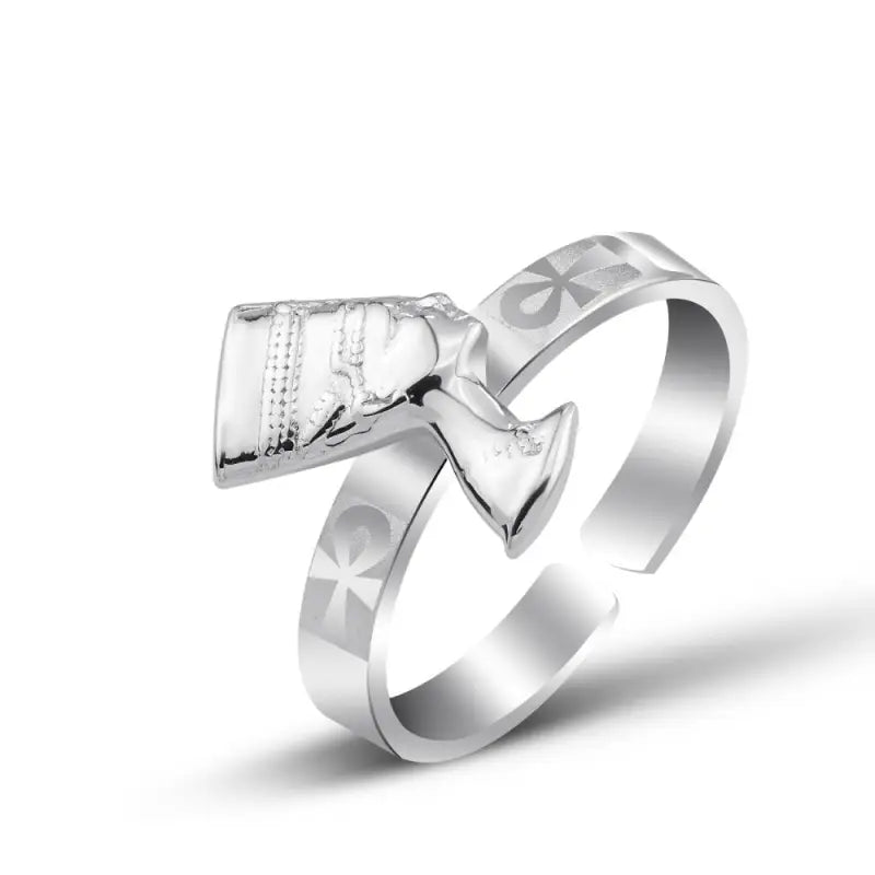 خاتم فضة عيار 925 مصمم بدقة، يجمع بين جمال رأس نفرتيتي الأيقوني؛ قطعة مجوهرات فريدة تجمع بين التاريخ والجمال، مثالية لعشاق الحضارات القديمة والتصاميم الفريدة.