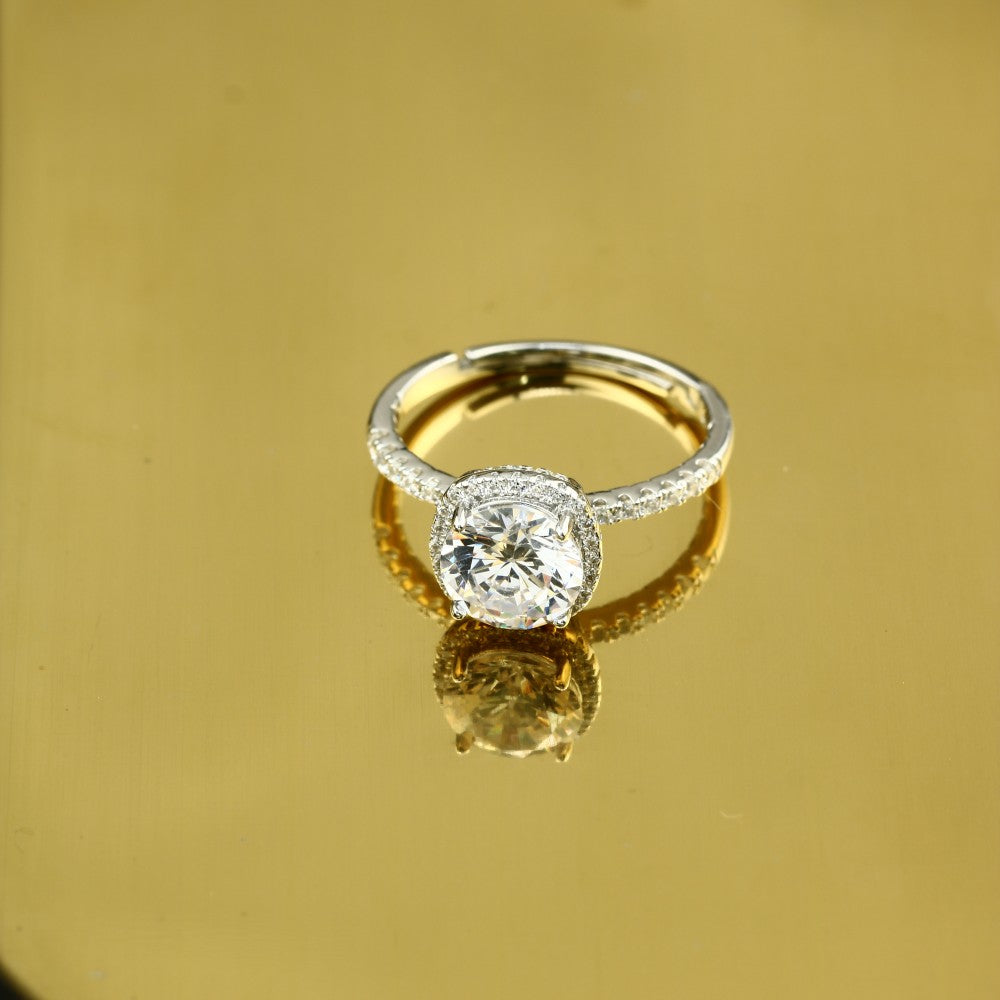يتميز الخاتم بحجر الزركونيا المكعب المذهل، وهو حجر كريم مشهور ببريقته ووضوحه. التصميم أنيق وبسيط، مع الحجر الكريم المركزي في مركز الصدارة. تضيف الأذرع الجانبية الرقيقة والنحيلة، المزينة بحجر الزركونيا المكعب الصغير المتلألئ، لمسة من التألق والأنوثة إلى الخاتم. الحجر الكريم المركزي مقطوع بشكل دائري، وهو قطع كلاسيكي وشائع للأحجار الكريمة.