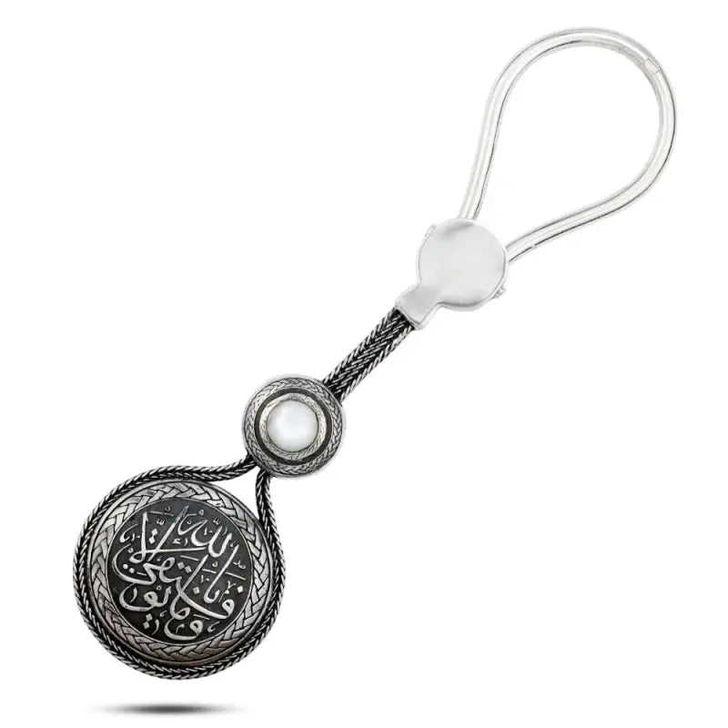 استمتع بجمال الفن العربي الأصيل مع سلسلة المفاتيح هذه المصنوعة من الفضة الإسترلينية عيار 925، والمصممة بأناقة بنقوش عربية متقنة، والمزينة بحجر عرق اللؤلؤ الأصلي. ترمز هذه السلسلة إلى النقاء والحكمة والأناقة الخالدة، مما يجعلها قطعة ثمينة للاستخدام اليومي. يتكامل حجر عرق اللؤلؤ، بلمعانه الطبيعي، بشكل رائع مع الفضة الإسترلينية عالية الجودة، بينما تضفي النقوش العربية المفصلة لمسة ثقافية وفنية. تضمن حرفية السلسلة الرفيعة وتصميمها المتين جمالاً ودلالة تدومان طويلاً. سواءً كتذكار شخصي، أو تميمة روحية، أو هدية مميزة، فإن سلسلة المفاتيح هذه مزيج مثالي من التراث والرقي.