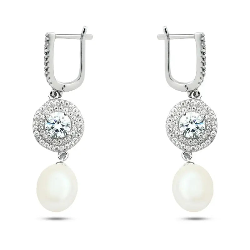 حلق فضة عيار 925 مرصع بفصوص من الزركون اللامعه و لولي بيضاوي الشكل
