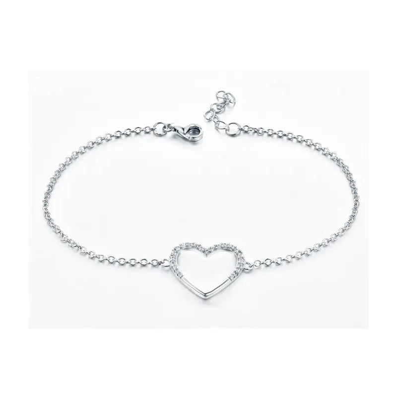 يتميز هذا السوار المصنوع من الفضة الإسترلينية عيار 925 بتصميم مذهل على شكل قلب، ومزين بأناقة بأحجار الزركون المتلألئة لإضفاء لمسة من التألق. تضمن الحرفية الدقيقة والمتينة جاذبية رومانسية خالدة، مما يجعله مثاليًا للارتداء اليومي أو المناسبات الخاصة. يوفر المقاس القابل للتعديل الراحة والتنوع، بينما توفر الفضة الإسترلينية عالية الجودة لمعانًا يدوم طويلاً. رمز للحب والأناقة.