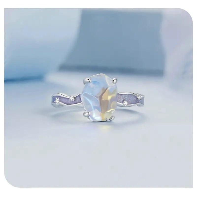 يتميز الخاتم بحجر أورورا، وهو حجر كريم يتميز بتلألؤه الفريد وتغير لونه مع تغير زاوية الضوء، مما يضفي عليه سحرًا خاصًا. عادة ما يكون لون حجر الأورورا أبيض مائل إلى الأزرق أو الأرجواني، كما هو الحال في الصورة يتميز تصميم الخاتم بالأناقة والرقي، حيث يبرز حجر الأورورا بشكل واضح في وسط الخاتم. تصميم الأذرع الجانبية مموج ومزين بطلاء أزرق فاتح، مما يضيف لمسة من الحداثة والأناقة للخاتم. كما تم تزين الأذرع الجانبية بعدة أحجار صغيرة لامعة، مما يزيد من بريق الخاتم